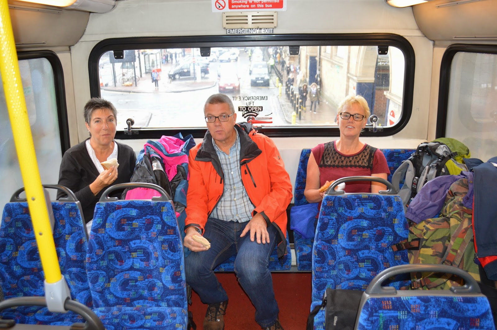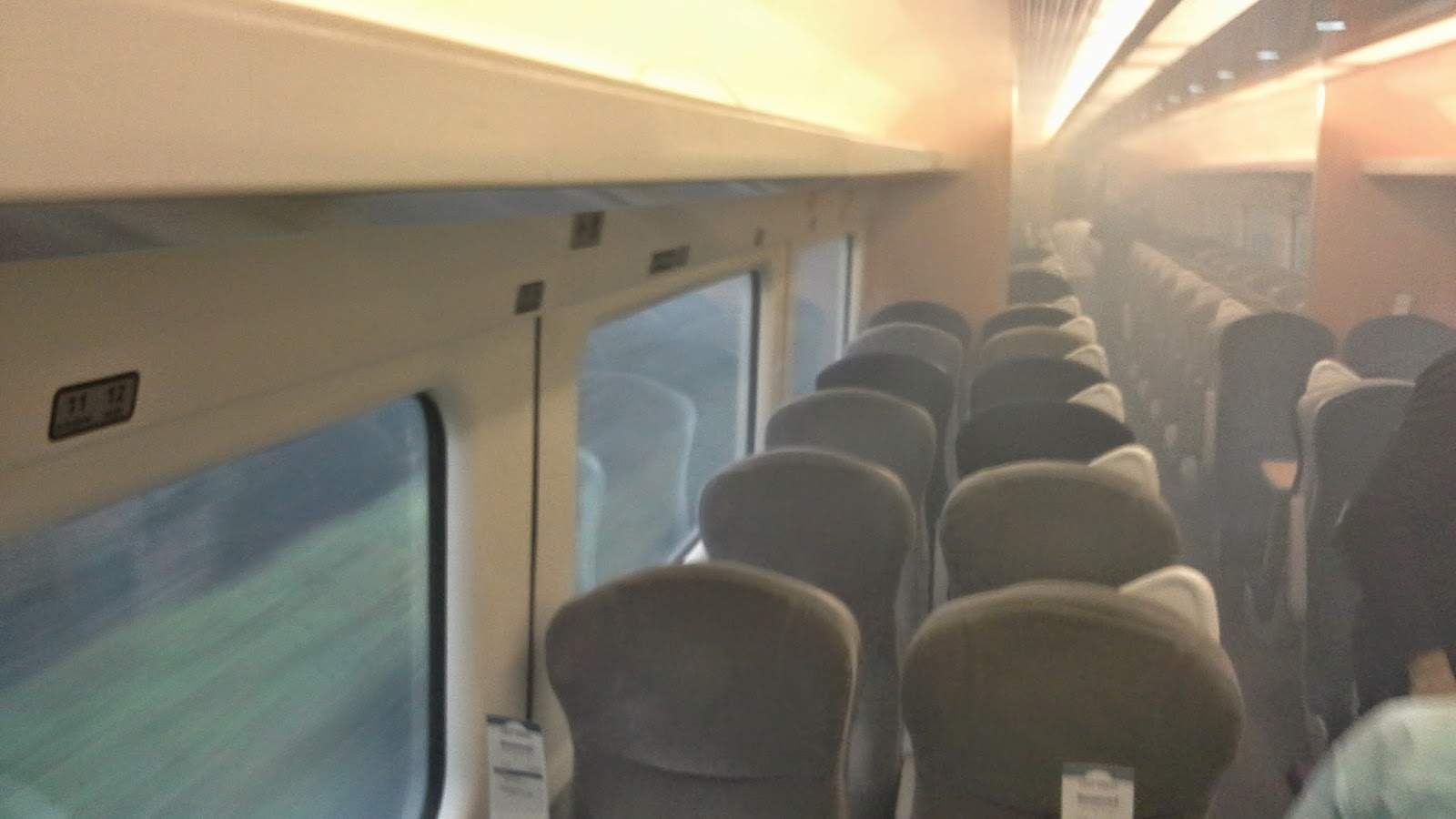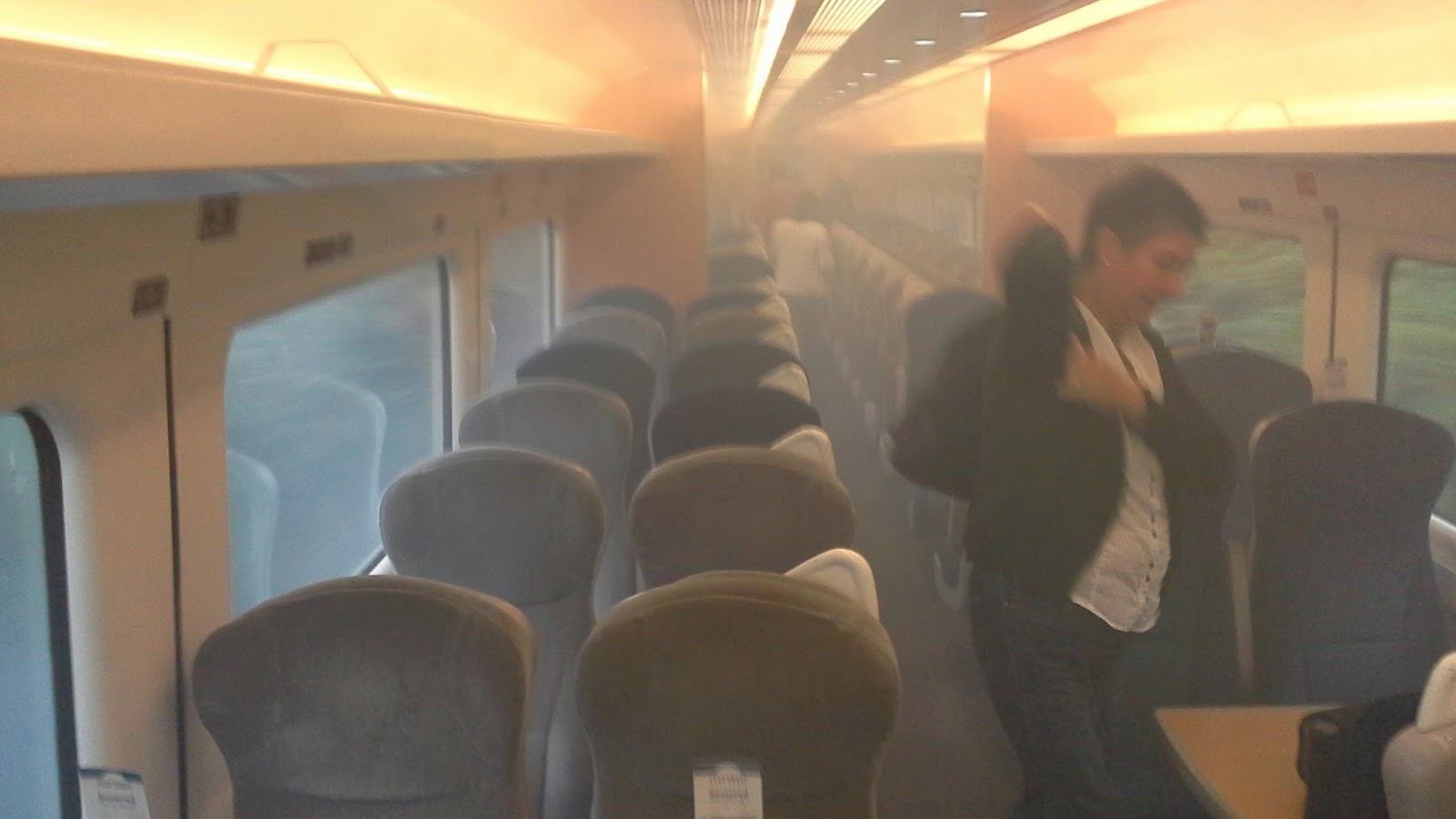 Vandaag moeten we vroeg uit de veren, omdat onze trein om 7.30 uur vertrekt. Dit betekent dat we niet rustig bij Suzanne en John in het guesthouse kunnen ontbijten. Dat wordt opgelost. Suzanne heeft voor ieder van ons een heerlijk ontbijttas klaargemaakt waarvoor ze gisteren onze wensen doornam. Heerlijke broodjes, zelfgemaakte choco- banaanmuffin en meer lekkers. Het is droog wanneer we naar het station lopen. Bij het oversteken blijft het een aandachtspunt om eerst naar rechts en dan naar links te kijken. Alle vier gaan we er wel een keer de fout mee in. Gelukkig blijft het hooguit bij de schrik dat er ‘opeens’ een auto vlakbij is. We hebben gereserveerde plaatsen en bemerken tot onze tevredenheid dat we vlak naast de restauratiewagon zitten. Ja, daar doe je ons plezier mee. Dachten wij… Direct na vertrek valt ons dat de trein best wel herrie maakt op de plek waar onze wagon verbinding maakt met de dranken- en spijzen wagen. Misschien moet ie nog even warm lopen. Ongeveer een half uur later merkt Jos, die het dichtst bij de deur zit, dat hij een brandlucht lijkt te ruiken. Zal wel een verbrandde tosti zijn merken wij laconiek op. Toch, nog geen halve minuut later ruiken we het allemaal en ook de mensen achter ons en verder in het rijtuig maken opmerkingen. Dan, opeens, lijkt, komt er rook de coupé binnen. Binnen de kortste tijd ontwikkelt zich een niet te negeren rookgordijn. Nu kan niemand meer rustig blijven. Iedereen staat op en weet niet goed wat te doen. Weet het treinpersoneel het al? Wordt er al iets ondernomen? Ik zie de noodrem. Moet ik er aan trekken? Als ik naar buiten kijk zie ik dat we over een brug rijden. De diepte daaronder ziet er nu niet aantrekkelijk uit, als de trein nu stopt kunnen we er nog niet uit.