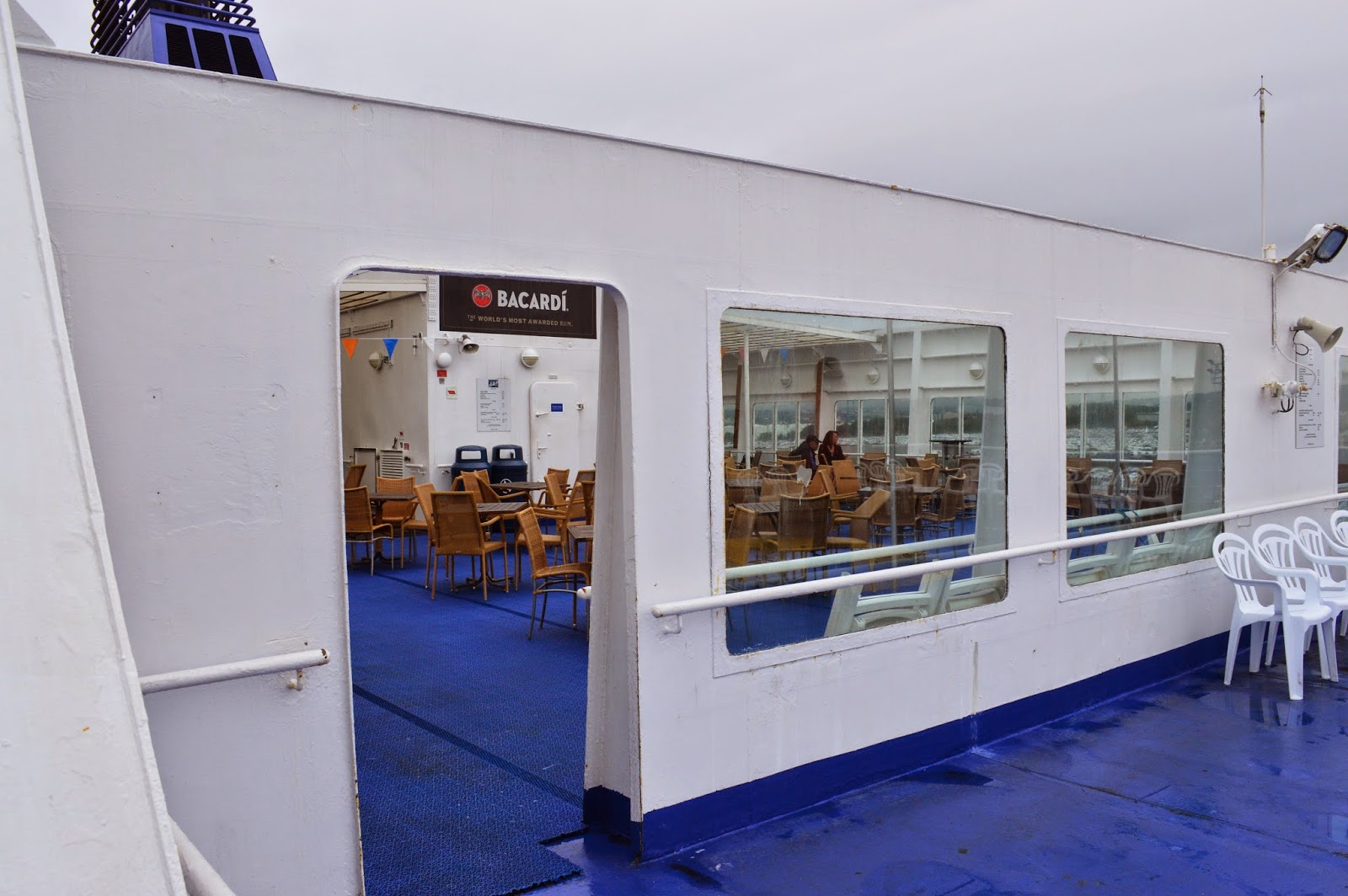 We kuieren over diverse dekken en kijken toe hoe personenauto’s, bussen, vrachtwagens en campers de boot oprijden. Zoals altijd schalt de muziek over de boot als die uitvaart. Het voelt als een lang afscheid en de neiging is om naar dierbaren op de kade te zwaaien die snikkend terug wuiven met zakdoekjes in de hand. Alleen, er staan geen dierbaren. Dan begint het te plenzen, we vluchten snel naar binnen voor jawel, weer eens een lekker bakje cappuccino. We kunnen niet nalaten het te hebben over de geweldige mazzel van afgelopen week. We gingen uit van regen en mist zodat het alleen maar kon meevallen. En het is meer dan dat: korte mouwen en soms een vest, in september, in Schotland. Dan ben je voor het geluk geboren 😉 Later eten we nog een lekkere maaltijd in één van de restauraties en zoeken dan de taxfree winkels op. Het zal inmiddels niemand verbazen dat Jos een aankoop in de whiskyhoek doet, Theo en ik gaan voor de literfles Tia Maria. ‘s Avonds wordt weer leuk: in een rugzak smokkelen we de meegebrachte fles wijn, de bierblikjes, de chips en de plastic bekertjes naar een gezellig hoekje.