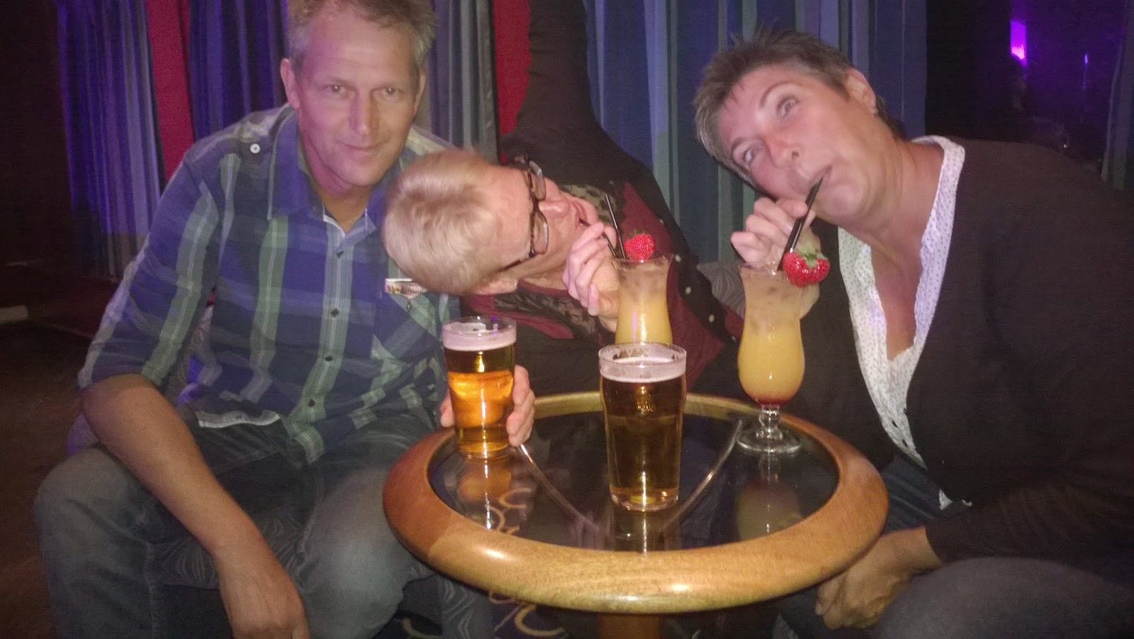 Drinkend, happend, gezellig pratend en lachend blijven we daar zitten tot er geen druppel meer over is. Dan wordt het tijd om naar de nachtclub te gaan. De zangeres is een betere dan de heenweg, ook het volume is minder. Prettig,kun je elkaar tenminste verstaan. De mannen gaan nu aan het betaalde bier en Gerda en ik doen gek en bestellen een cocktail ‘Poison’ met wodka en jus d’orange. lekker, maar lolliger dan we waren worden we niet 😉 We vermaken onze met de Engelse kwis die wordt gedaan: een lied klinkt en wie het weet mag naar voren stuiven. Degene die als eerste in een speciaal daarvoor uitgekozen stoel gaat zitten, mag het antwoord geven. Het is vooral een jonge meiden aangelegenheid die, als het uitkomt, met z’n drieën op elkaar gaan zitten. Tegen middernacht nokken we af en zoeken onze naast elkaar gelegen hutten op voor de laatste nacht.