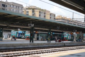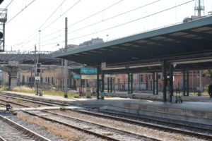 We verlaten het perron, pas als dat helemaal leeg is mogen nieuwe passagiers het perron op. We passeren de poortjes met beveiligingsbeambten en gaan op zoek naar wc’s en broodjes. We blijken slechts één euro bij ons te hebben voor het toilet, dat is een euro tekort. Ik krijg voorrang, gelukkig, want als ik moet ben ik nauwelijks meer te houden. De wc’s zijn redelijk, uiteraard weer zonder bril. Het slot is voldoende, maar lijkt een farce door de enorme kier tussen deur en wand. Rare jongens die Romeinen.