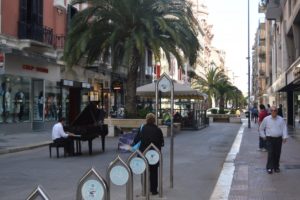Het is nog vroeg en rustig op straat. We begeven ons door de brede winkelstraat en zien daar tot onze verrassing, midden op straat, een pianist aan het spelen op een vleugel. Natuurlijk blijven we even staan en luisteren, zoals ook anderen de pas inhouden en zich concentreren op de mooie klanken die goed passen bij een ontwakende stad.