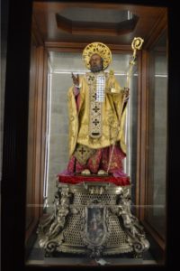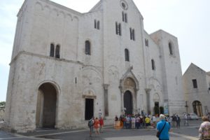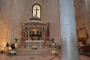 Als we verder gaan komen we uit bij de kathedraal Nicola. We kunnen naar binnen waar we bijzondere plafondschilderingen zien met glazen nissen waarin beelden van kostbaar uitziende heiligenbeelden. Ook is er een soort cel, afgesloten met hekwerk waarachter we allerlei voorwerpen zien: verzamelde relikwieën verzameld vanaf de Middeleeuwen. Een trap leidt naar beneden. Mensen, waaronder Italiaanse vrouwen en meisjes met omslagdoeken/ hoofddoeken zien we die afdalen. Toeristen volgen. Al zijn sommigen van die laatste groep ook in korte broek, wij twijfelen. Nieuwsgierigheid wint en we volgen. Beneden is een indrukwekkend gewelf dat vol staat met mensen, allemaal gericht op de gehouden mis achter traliewerk, waarachter wij een priester, een koortje en een non zien. De aanwezige mensen bidden, ook diverse toeristen. Wij blijven achterin staan. Uiteraard gebruik ik mijn fototoestel niet. In een hoek vlakbij ons staat, eveneens achter traliewerk, een marmeren zuil. Mensen stoppen briefjes door de openingen waardoor er een hele stapel op de grond ligt.