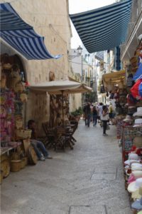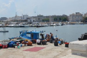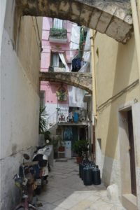 We zetten onze tocht door Bari voort en komen in een oud gedeelte met smalle straatjes. Mensen die voor de deur zitten, gezellig babbelend voor de deur met op het eerste oog alle tijd van de wereld. En overal balkonnetjes met lijntjes en rekjes waaraan de was te drogen hangt.