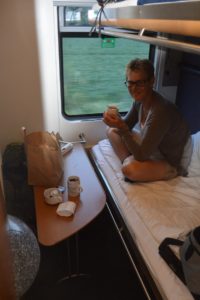 Het is nu half zeven, over een half uur vertrekken we. Onze tweepersoonscabine is vrijwel hetzelfde als de heenweg, alleen de wastafel zit op een andere plek. Handiger, nu kunnen we de bagage iets praktischer kwijt. We installeren ons op het onderste bed, krijgen van de conducteur ieder een flesje water en koffie en kijken uit naar onze rit door de nacht.