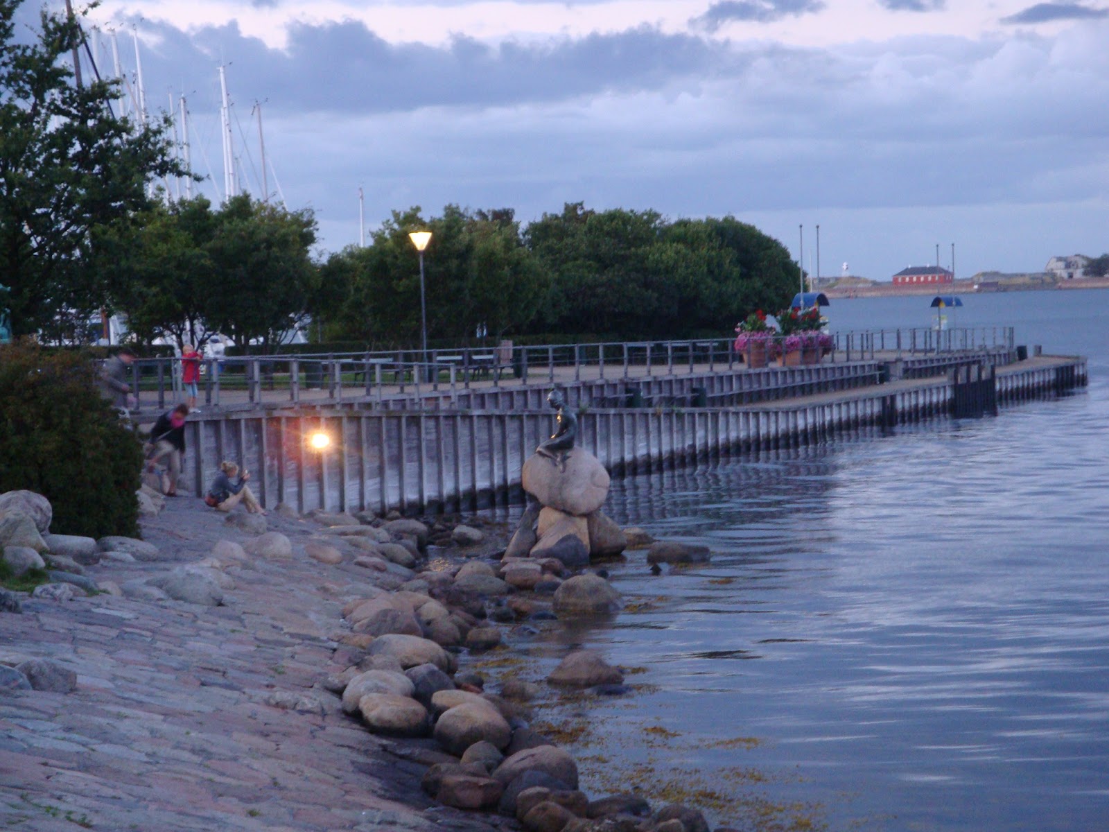 Het begint al te schemeren als we eindelijk bij de beroemde zeemeermin aankomen. Er zijn meer mensen, gelukkig niet hinderlijk veel. Het blijft raar, dit Mona Lisa effect. Vooral de bekendheid maakt het aantrekkelijk, echt niet omdat het hét mooiste, het meest prachtige is. Zo bijzonder is het beeld niet, ik zoveel mooiers en indrukwekkender gezien op de weg hier naartoe. Maar goed, we klikken de foto’s en genieten van het mooie uitzicht. De schemering, de lichtjes van boten en huizen in de verte, tezamen met het kabbelende water en de uitkijk over het water dragen rust over. Expeditie zeemeermin is geslaagd.