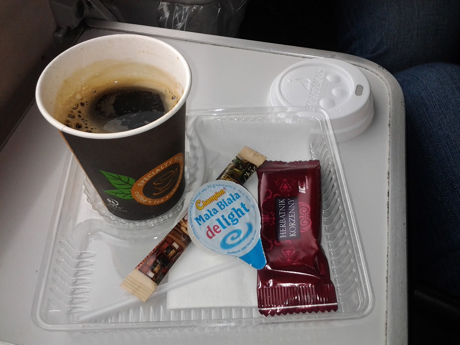 Onze trein richting Berlijn vertrekt om 9.50, dat betekent rustig ontbijten, de tassen in orde maken en uitchecken. We verlaten het hotel, waar ooit Juliana En Bernard gelogeerd hebben, in de stromende regen. Prettig dat het station slechts een paar minuten lopen is. In drie uur tijd treinen we naar Warschau, onderweg stoppen doen we niet. We delen de coupe met twee Russische vrouwen en een Poolse jongen. Theo biedt de vrouwen aan hun koffers in het bagagerek te leggen en heeft daarmee hun harten gestolen, vragen waar hij vandaan komt en lijken nauwelijks te weten waar Holland ligt. Communicatieprobleempje, ze spreken geen enkel woordje engels. Die nieuwe liefde gaat het dus niet redden. De dames gaan lekker slapen, snurken gezellig met de mond open. Op zo’ moment kriebelt het bij mij om een foto te maken. Helaas heb ik net te veel fatsoen om daar aan toe geven, jammer. Mijn goede opvoeding is soms lastig. Een half uur na vertrek komt er cateringmeneer met een karretje, of we koffie of thee willen, het is gratis. Ongekend, wat een service van de Poolse spoorwegen. En of het niet op kan, zit er zelfs een koekje bij.