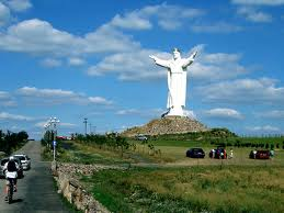 Opeens vraagt een van de Duitse mannen onze aandacht voor een bezienswaardigheid buiten, een enorm christusbeeld, veel groter dan in Rio de Janeiro. We haasten ons de coupe uit, en inderdaad een joekel van een beeld doemt op in het landschap. In het plaatsje Swiebodzin.