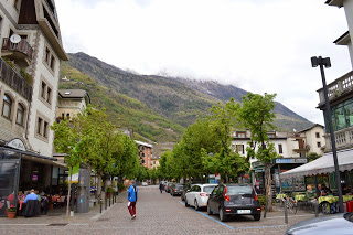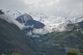 De bus is nauwelijks voor de helft gevuld als we vertrekken en meer komt er ook niet bij in de drie uur die we nodig hebben om in Tirano te komen. Het regent, de lucht is grauw en wolkenslierten hangen voor de bergen. Dat is best een mooi gezicht, met al het mooie weer van de afgelopen week geeft dit een nieuw zicht op de bergen.