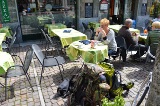De bus staat bij het station en we stappen stevig door, geen probleem met de rugzakken.Ook de regen draagt ook bij aan een goed tempo. Ik zie te laat dat de bus op een vreemde plek staat, namelijk op een niet meer door treinen gebruikt stuk beton met rails. Ik maak een bocht naar de deur, stap scheef in een rails, kan mij zelf niet meer overeind houden en maak een aardige smak op het wegdek. Waarschijnlijk vangt de rugzak de eerste klap op want ik kom redelijk terecht, wel schrik ik me natuurlijk te pletter, tijdens de flitsende val zag en voorvoelde ik de pijnlijke gevolgen. Gelukkig, het valt alles mee, mijn linkerkant is goed nat en de pols gevoelig maar na een paar uur is ook dat leed geleden.