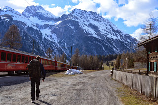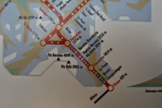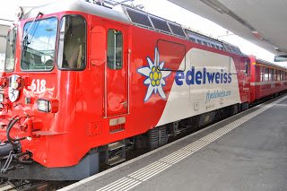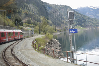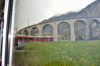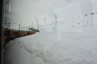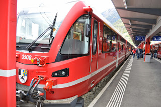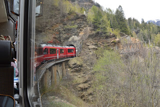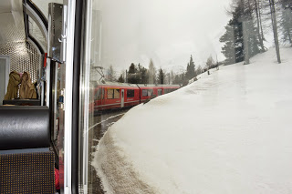 Dat komt goed uit, want we hebben hier een uur overstaptijd en trek in koffie. We bestellen cappuccino en vallen bijna van onze stoel van geluk als we de prijzen zien, 1.30 euro ( we zitten in Italiaans eurogebied). In Zwitserland heb je daar niet eens een lepeltje voor, betaal je rond vier euro per gevuld kopje. Euforisch bestellen we nog een pot en stuiteren iets later energiek van de extra cafeïnestoot de Bernina Express in. De panorama trein heeft extra grote ramen voor het beste zicht. De lucht is nu zo opgeklaard dat het duidelijk is wie er gewonnen heeft, de wolken ruimen steeds meer het veld of nemen een bijrolletje aan.