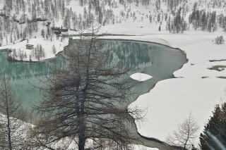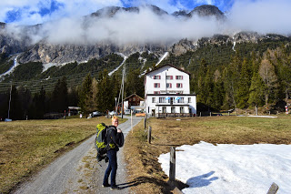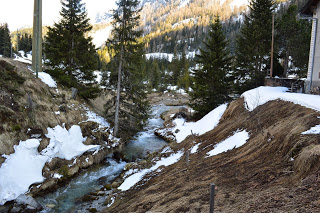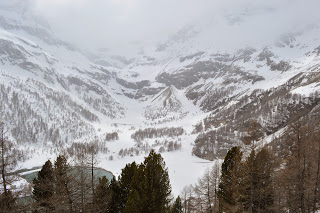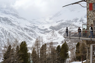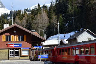 En Preda is een plaatje, geweldig! Mooi! WAUW!WAUW!WAUW! Een stationnetje, bergen en heel sneeuw. In het hotel aan de overkant horen we dat er vanmorgen 20 cm. neeuw is gevallen. We gooien onze spullen op de kamer met geweldig uitzicht. We voelen ons weer helemaal in Zwitserland en gaan een stuk wandelen. Alles natuur, af en toe een huis, terwijl er van menselijke aanwezigheid geen sprake lijkt. We lopen een uur, genieten volop en vinden het speciaal om met zn tweeën hier te lopen, in dit ogenschijnlijk onbevolkt gebied. We hopen dat de foto’s kunnen weergeven van wat wij hier ervaren. Het is een prachtig wandelgebied dat ook in de zomer geweldig moet zijn. Maar nu staan de sleetjes en de snweeuwschuiver nog op het terras. Pas terug in het hotel zien we weer mensen, de drie personeelsleden en de zes andere gasten. We eten in het aanwezige restaurant een meer dan uitstekende en goed uitziende vegetarische maaltijd en laten het tot ons doordringen: we zitten in een vallei, hoog in de bergen op 1750 meter hoogte, met slechts een handjevol andere mensen, ver weg van de dikker bevolkte steden en dat bevalt nu goed. Heel goed.