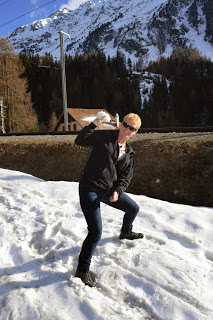 Natuurlijk maken we foto’s, maar je moet het eigenlijk gewoon zelf zien en beleven. We rijden nu op ruim 2000 meter hoogte en overal waar we kijken liggen pakken dikke sneeuw. Hartje winter maken wij thuis er nog geen vlokje van mee, helaas. Dus, ja we genieten opnieuw volop. In het plaatsje Alp Grüm stopt de trein en kunnen we er een kwartiertje uit. Het sneeuwt en het uitzicht is schitterend wit, terwijl het zonnetje heerlijk schijnt. Hoe zal het nu in Lugano zijn? Nog steeds stromende regen, grijs en grauw? En in Tirano, zitten ze daar nog in lente omstandigheden op het terras? We vervolgen de tocht naar Pontresina waar we moeten overstappen en een wachttijd van drie kwartier hebben. We smeren een paar broodjes in de wachtkamer en luisteren ondertussen naar de steeds wanhopig wordende loketbeambte die aan drie Aziatische jongens probeert uit te leggen wat ze nodig hebben om een kaartje te kunnen kopen. Er is veel ruis, maar beide partijen blijven heel beleefd tegen elkaar. Daarna maken Theo en ik nog een ommetje rond het station en krijg ik de zenuwen als ik drie knullen met een geweer op hun rug zie rondlopen. Van Theo weet ik al dat Zwitserse militairen hun wapens mee naar huis mogen nemen, we zijn er deze week al meerdere tegengekomen, vond ik ook al niet prettig. Deze jongens hebben echter geen enkele militair herkenningsteken, hoe moet ik dan zeker weten dat ze geen snode plannen hebben? Ik trek Theo een andere kant op en vertel hem ondertussen welke strategieën ze mogelijk uitgedacht hebben en ik weiger slachtoffer te worden. Ik ben nog jong, heb thuis bloedjes die me niet kunnen missen. Bovendien heb ik nog een tientje schuld bij vrienden. Volgens Theo sla ik op hol en stel ik me aan, maar als we later in de trein stappen en de jongens achterblijven heb ik het opgeluchte gevoel aan een ramp te zijn ontsnapt.