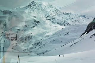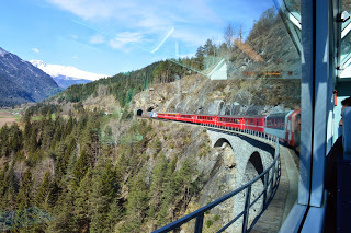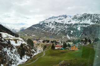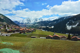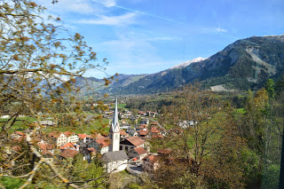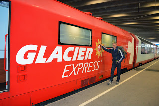 De treinrit is een speciale, we gaan met de Glacier Expresss, de trein stopt op het station van Preda en als we zijn ingestapt is het perron uitgestorven. De gereserveerde stoelen bij het raam bieden een riante zitplek. De ramen zijn van het panorama type en glashelder. Het personeel heet ons uiterst vriendelijk welkom en wij hopen dat de trein zo rustig blijft als die nu is. Het lijkt ons een aannemelijke gedachte: wie gaat er nu op Eerste Paasdag…., veel mensen dus. Na anderhalf uur stroomt de trein vol en worden de zitplaatsen naast ons bezet door twee jongens, mannen moet ik zeggen.