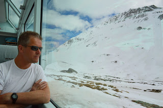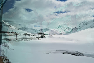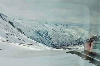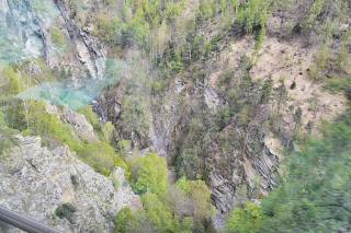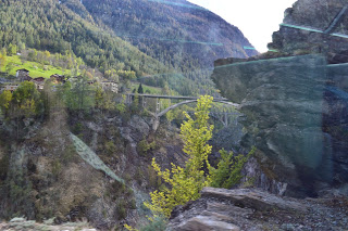 Het weer vandaag is opnieuw schitterend, de lucht is nog net niet strakblauw, kortom het landschap toont zich van zijn zonnigste kant. En dat is mooi, heel mooi. Heel veel bruggen, haastig stromende beken, diepe ravijnen, groene valleien, witte bergen, groene bergen, lente met bloeiende bomen, winter met overal sneeuw, hoge rotswanden en we gaan door heel veel tunnels. In totaal 291 bruggen en 91 tunnels.