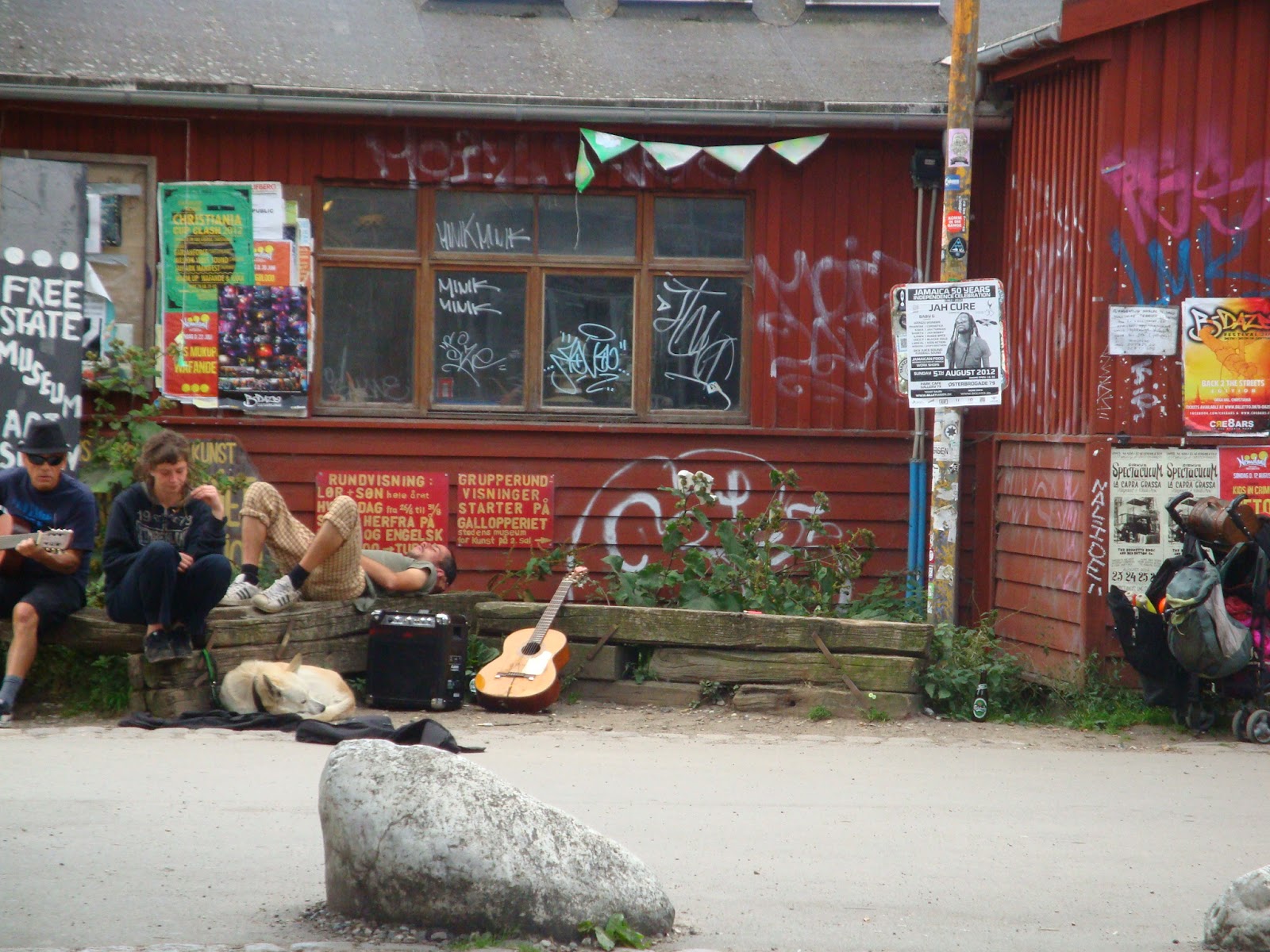 Het programma voor vandaag was al besproken. Eerst naar Christiania, een oud militair kamp dat begin jaren zeventig gesloten werd. De barakken en het terrein werden door jongeren gekraakt en ingenomen. In de loop der tijd is het uitgegroeid tot een aparte gemeenschap die tot op de dag vandaag gedoogd wordt. Publiek is welkom, maar het maken van foto’s is verboden. Overal staan borden die dat duidelijk maken, niemand die zich er niet aan houdt. Ze durven waarschijnlijk niet, net als wij. Hoewel er ook her en der borden staan die wijzen op de wetten van Christiania die agressie en het dragen van wapens verbieden, ademt de sfeer uit dat je maar beter geen trammelant kan opzoeken. We zien talloze met graffiti bespoten barakken, twintigste hands meubilair. Maar ook de nodige kunstzinnige uitspattingen. Veel kleur. Er is een winkeltje op het terrein, een eigen sportschool, een activiteitenprogramma voor kinderen, een smederij, van alles. Zelfs een fietsenwinkel. Bewoners zitten her en der met koffie, vaker bier en een joint. Softdrugs kopen is hier totaal geen probleem. In de ‘Green Area’ staan open en bloot een soort van marktstalletjes waar de nodige genotsmiddelen uitgezocht kunnen worden. Het bordje ‘Fuck the police’ zegt genoeg. Zelfs in het mogelijk om in Christiania iets te eten of drinken in de de paar aanwezige bars en restaurantjes. Voor souvenirs kun je terecht bij de kraampjes op een geïmproviseerd pleintje. Terug in de tijd kijk je hier je ogen uit.