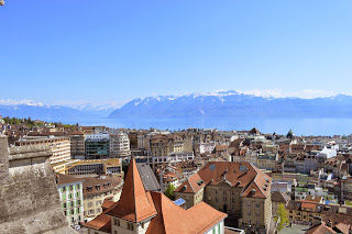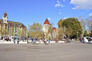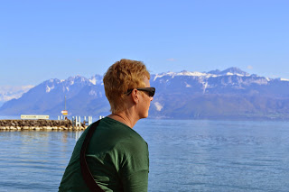 We lopen in een zo recht mogelijke lijn naar beneden en komen dan uit op de boulevard aan het meer van Genève, en daar is het gezellig en sfeervol. Een grote speeltuin voor kinderen, grote schaakborden en een ander ‘bord’spel, overal bankjes, wandelaars, watertjes, bootjes, waterfietsen en terrasjes. Tegen de achtergrond van het mooie grote, gladde meer en besneeuwde bergen. Er hangt zo’n relaxte sfeer. Jong, oud en alles wat er tussenin hangt vermaakt zich hier. We wandelen langs het water, door de parkjes en vlijen ons op een knus plekje neer en genieten. Lausanne heeft het goed gemaakt. En daar nemen we op een terrasje met uitzicht op de boulevard een drankje op.