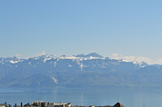 Het eerste deel van het traject is naar Zurich dat we ook op de heenreis gereden hebben. Het is prachtig weer wat het uitzicht uiteraard ten goede komt. Veel groene weiden en regelmatig grote koolzaadvelden. Soms zien we de besneeuwde bergen, soms is het landschap niet meer dan heuvelachtig te noemen. Het is prettig om lekker tegen het raampje te hangen en naar buiten te kijken. Na twee uur komen we in Biel/Bienne, waar we moeten overstappen. En opeens is alles anders. Opeens wordt er nergens meer Duits gesproken en zijn alle borden in het Frans. De overgang is bijna bizar te noemen. Ook het landschap is anders. We treinen nu grote stukken langs het glinsterende water van Neuchâtel en ook komen we langs vele wijnvelden. Het landschap krijgt daarmee iets mediterranees, met haventjes waarin plezierjachten en gezellige paviljoens aan het water. De trein neemt nu regelmatig bochten waardoor die enigszins schuin in de rails hangt. Het doet me vaag aan het soort kermisattracties denken waar ik vroeger wel graag in ging.