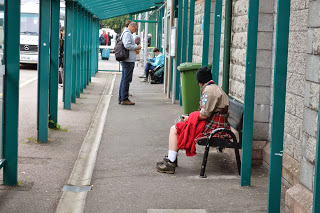 Na het ontbijt verlaten we om 8.30 uur het hotel en lopen met de rugzakken om naar het station. Bijzonder, er staat een hek voor. Pas als het bijna vertrektijd voor de trein is, gaat het hek open en mogen wij en de rest van de reizigers het perron op. Wij reizen zo’ n vijf kwartier en moeten dan overstappen in een plaats met een onmogelijke naam: ?? Het is zo langzamerhand gewoon geworden dat de namen in het Schots worden weergegeven. Soms met de Engelse naam eronder. Er zit meestal een wereld van verschil tussen. We proberen het uit te spreken, maar de tongen struikelen over vreemde letter combinaties. Vermakelijk is het wel.