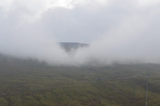 Het landschap verandert. Steeds meer rotsen worden zichtbaar, met meertjes en poeltjes ertussen. ook de heuvels worden hoger en zijn soms bergen te noemen. Het is echt heerlijk om naar buiten te kijken. Boeken en tijdschriften die we bij ons hebben worden niet meer ingekeken. Dit is Schotland met soms lichte mist, soms een zonnetje en her en der de eerste herfstkleuren. Het is gewoon lekker genieten. Hoewel we ons zorgen maken om de hele dikke meneer die in het zitje naast ons zat, maar nu al een hele tjd verdwenen is, terwijl zijn spullen er nog liggen. Zit ie steeds op de wc, waar een rij voor staat? Na ruim een uur komt hij de coupé binnenschommelen, en gelijk daar achteraan de kar met koffie waar wij steeds meer naar snakken. Gelukkig, alles is weer goed gekomen.