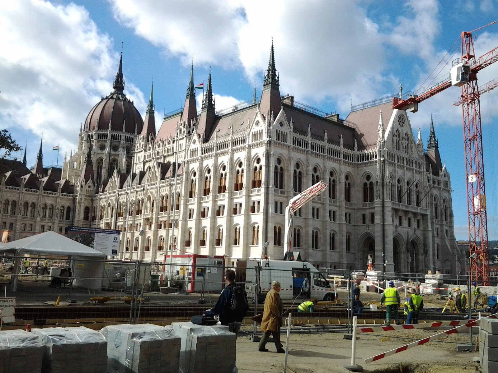 Er omheen is het een grote bouwput. Dat valt ons vaker op, aan de Pestkant wordt volop gerestaureerd en gerenoveerd. Dat geeft hoop voor de wat verpauperde delen. Vandaag ook veel werk in uitvoering te zien. We wandelen verder naar de Margitbrug, over de Donau, op weg naar Margit eiland.
