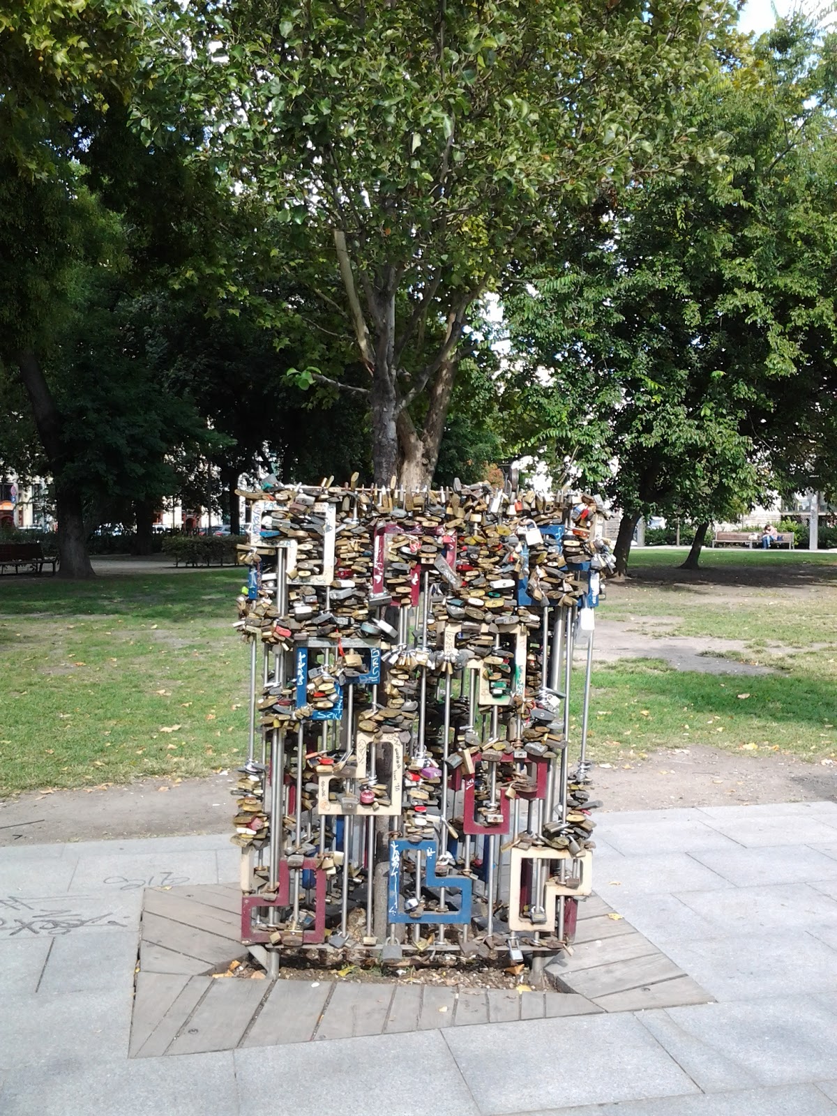 Met het boemeltreintje, gezeten op gestoffeerde bankjes, leggen we het korte traject af. Langs de oever aan Buda zijde lopen we naar de Bridge of chain waar we de oversteek terug naar Pest maken. Onderweg zien we opnieuw genoeg dat de moeite waard is om te fotograferen of over van mening te verschillen. Terug in Pest pakken we de metro, nu richting de Stepfanusbasiliek, de grootste kerk van Budapest, vernoemd naar de eerste christelijke koning van het land. Zijn gemummificeerde rechterland wordt jaarlijks nog in een processie meegedragen…De basiliek is beslist de moeite van een bezoek waard, evenals de beklimming van de 300 treden naar de koepeltoren. Het geeft een prachtig uitzicht over Budapest. Tenslotte gaan we naar het nieuwe, moderne autoloze centrum. De voeten hangen aan draadjes, de terrasjes lonken. Onderweg door een parkje zien we nog een boompje met ijzerwerk, waar talloze slotjes aan vastgemaakt zijn.