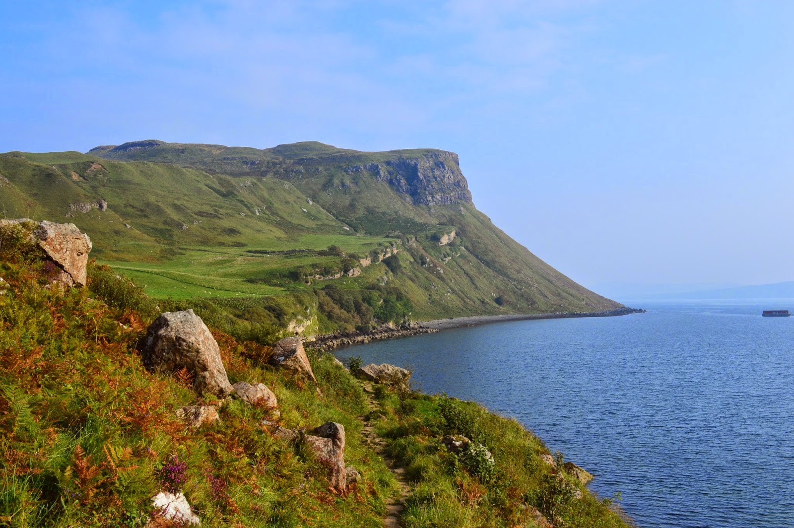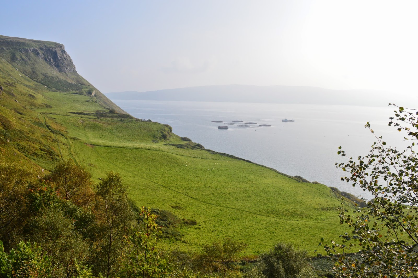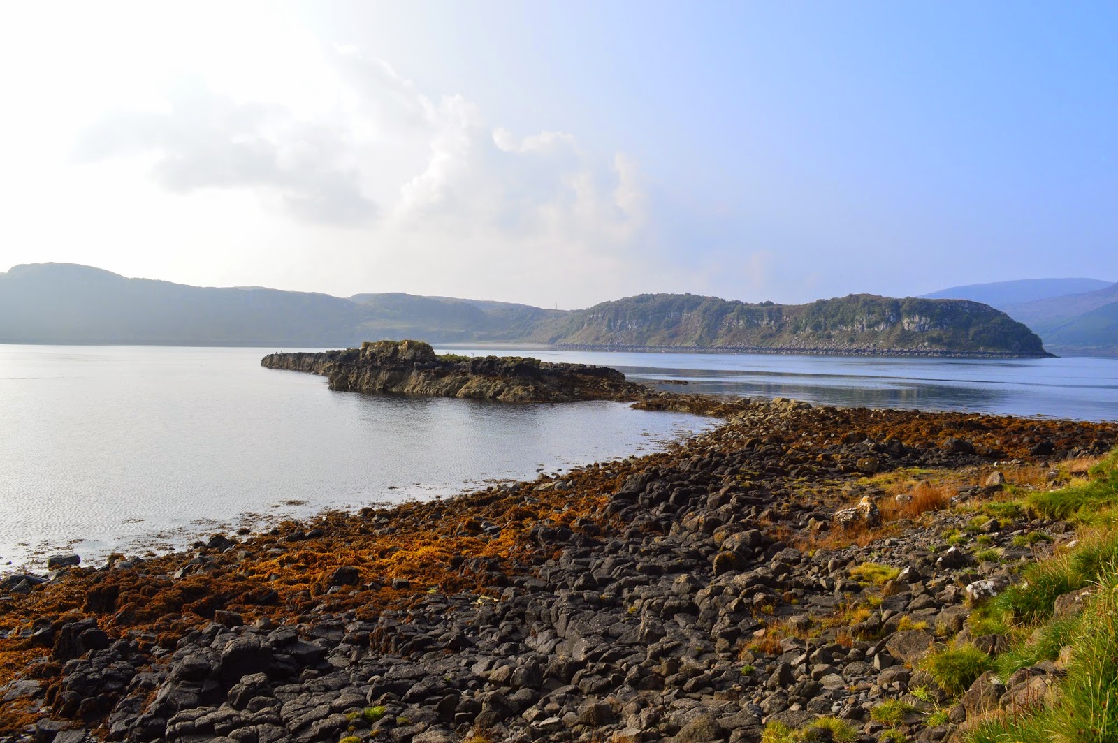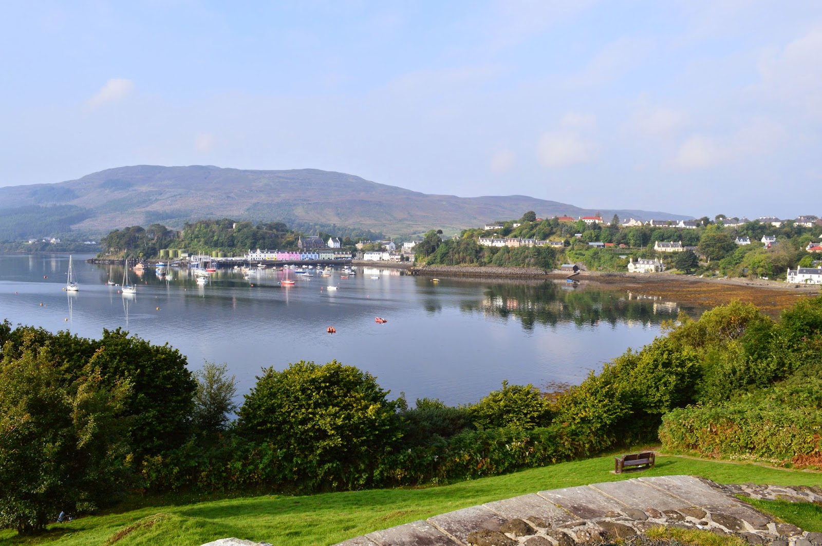 Langs het water gaat het langzaam omhoog. Het asfalt maakt plaats voor een smal pad door het struikgewas. Later wordt het rotsachtig en moeten we extra goed uitkijken waar we lopen. Het uitzicht is prachtig! Het water, de heuvels, het groen, de rotsen. Het zijn steeds dezelfde ingrediënten die voor een verrassend wisselend plaatje zorgen. We boffen weer, het zonnetje maakt alles zo mooi. En goed begaanbaar. Met regen is de kans op glibber- en dus valpartijen veel groter. Het zal niemand verbazen dat we veel foto’ s maken. Na zeker een uur omhoog geklommen te zijn komen we op een punt waar we om een berg heen kunnen en dalen achterlangs naar beneden. Geconcentreerd nemen we de afdaling tot we na in totaal zo’n zeven kwartier weer in het centrum uitkomen. Een superleuke tocht! Maar nu koffie. We komen bij een Mexicaanse gelegenheid die op een bordje zegt de lekkerste koffie van de stad te hebben. Dat willen wij proeven. Inderdaad is die erg lekker, evenals de worteltjestaart. Maar het is niet hetgeen op mij de meeste indruk maakt. Dat is het leuk uitziende meisje dat de bestelling opneemt. Of is het een jongen in wording..Ze heeft duidelijk de aanzet tot een snor en een sikje. Bizar is dat de andere drie het niet is opgevallen. Onbegrijpelijk. Observeren is een belangrijk deel van mijn vak, zal ik maar zeggen. We verlaten ‘ Arriba’ en gaan terug naar ‘ The pink House’ waar we ieder in ons eigen verblijf vertoeven. Tot het tijd is om naar plein te gaan waar we zullen opstappen voor de drie uur durende eilandtour. In het witte busje rijden we door het noordelijke deel van het Isle of Skye.
