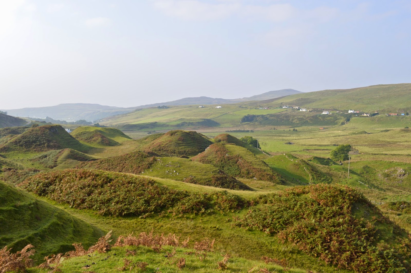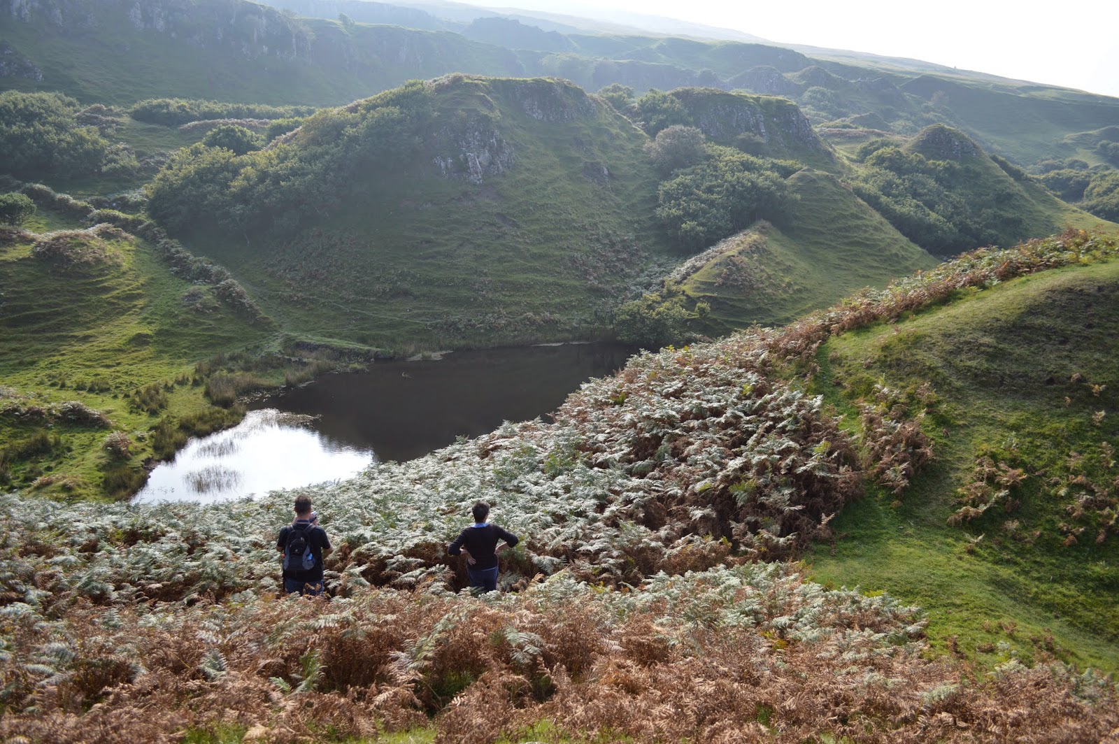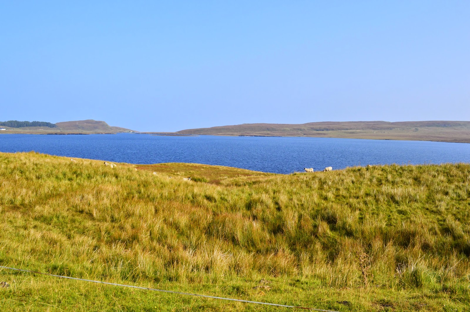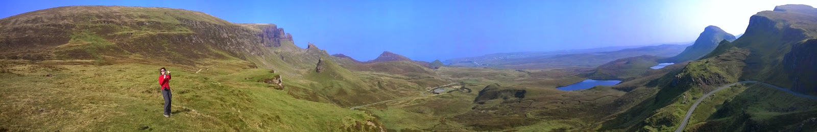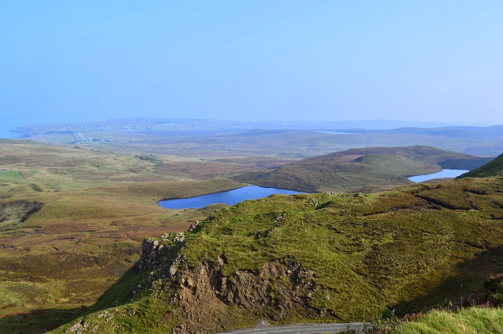 Langs het water gaat het langzaam omhoog. Het asfalt maakt plaats voor een smal pad door het struikgewas. Later wordt het rotsachtig en moeten we extra goed uitkijken waar we lopen. Het uitzicht is prachtig! Het water, de heuvels, het groen, de rotsen. Het zijn steeds dezelfde ingrediënten die voor een verrassend wisselend plaatje zorgen. We boffen weer, het zonnetje maakt alles zo mooi. En goed begaanbaar. Met regen is de kans op glibber- en dus valpartijen veel groter. Het zal niemand verbazen dat we veel foto’ s maken. Na zeker een uur omhoog geklommen te zijn komen we op een punt waar we om een berg heen kunnen en dalen achterlangs naar beneden. Geconcentreerd nemen we de afdaling tot we na in totaal zo’n zeven kwartier weer in het centrum uitkomen. Een superleuke tocht! Maar nu koffie. We komen bij een Mexicaanse gelegenheid die op een bordje zegt de lekkerste koffie van de stad te hebben. Dat willen wij proeven. Inderdaad is die erg lekker, evenals de worteltjestaart. Maar het is niet hetgeen op mij de meeste indruk maakt. Dat is het leuk uitziende meisje dat de bestelling opneemt. Of is het een jongen in wording..Ze heeft duidelijk de aanzet tot een snor en een sikje. Bizar is dat de andere drie het niet is opgevallen. Onbegrijpelijk. Observeren is een belangrijk deel van mijn vak, zal ik maar zeggen. We verlaten ‘ Arriba’ en gaan terug naar ‘ The pink House’ waar we ieder in ons eigen verblijf vertoeven. Tot het tijd is om naar plein te gaan waar we zullen opstappen voor de drie uur durende eilandtour. In het witte busje rijden we door het noordelijke deel van het Isle of Skye.