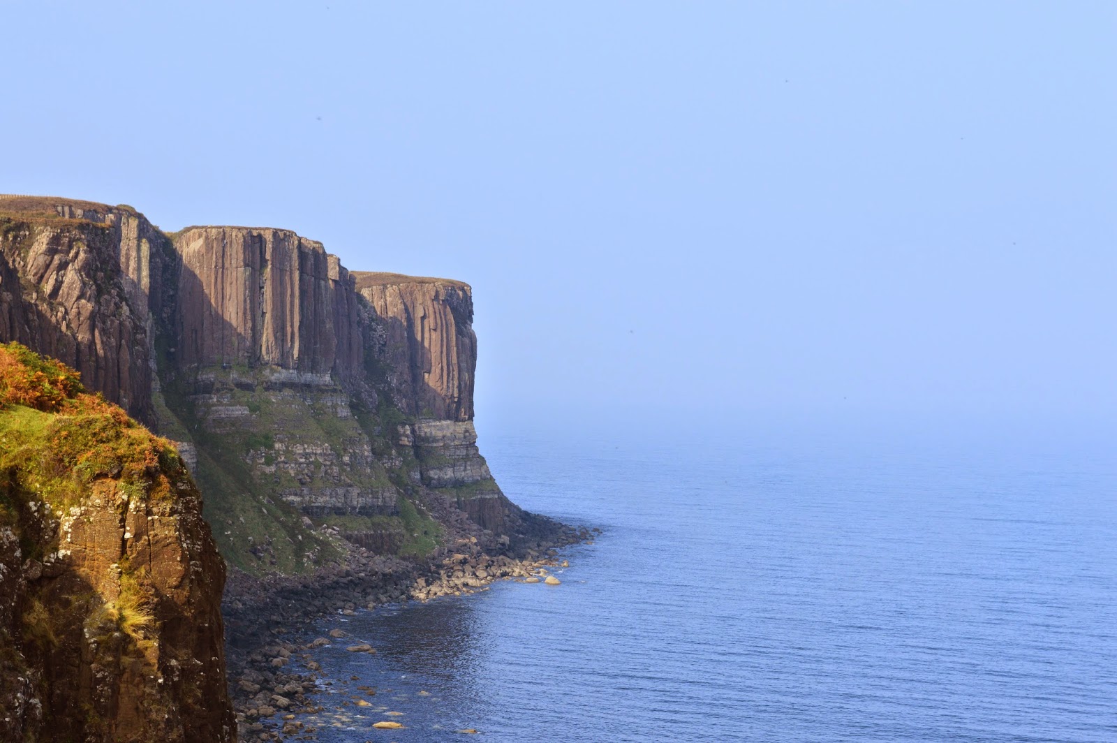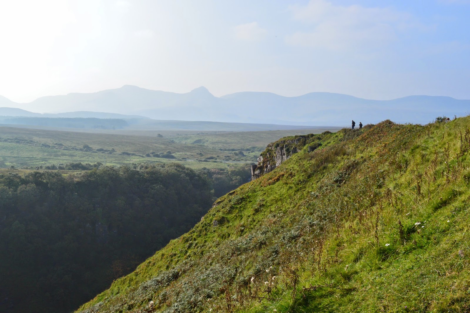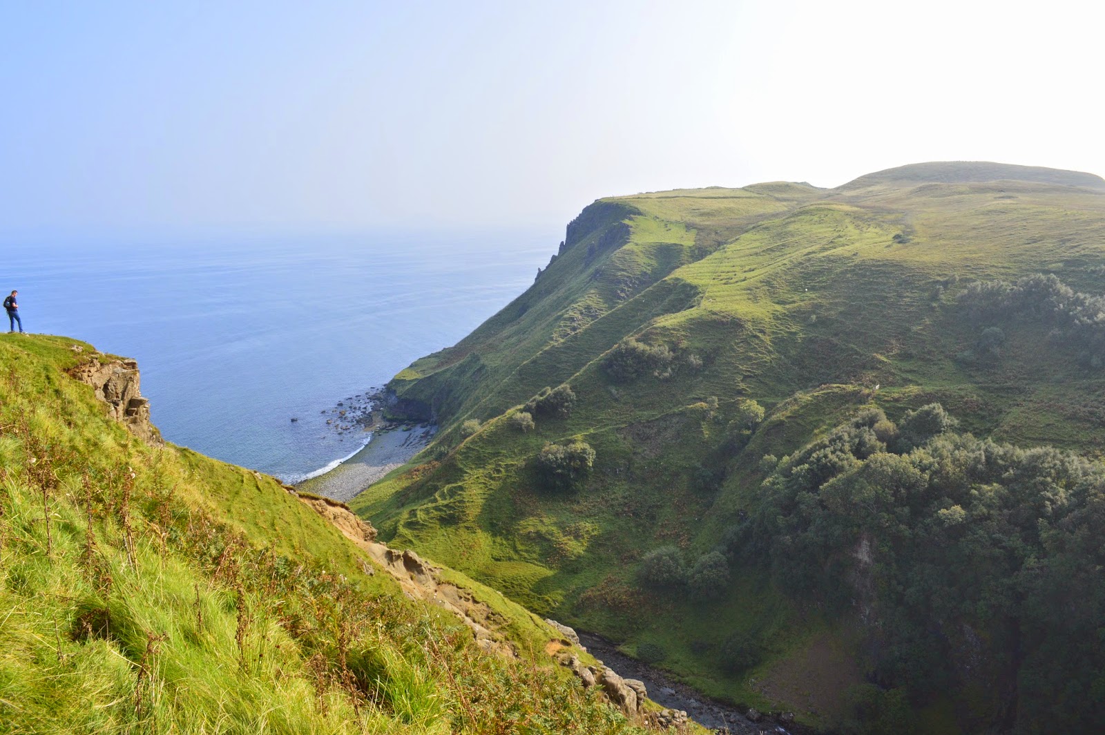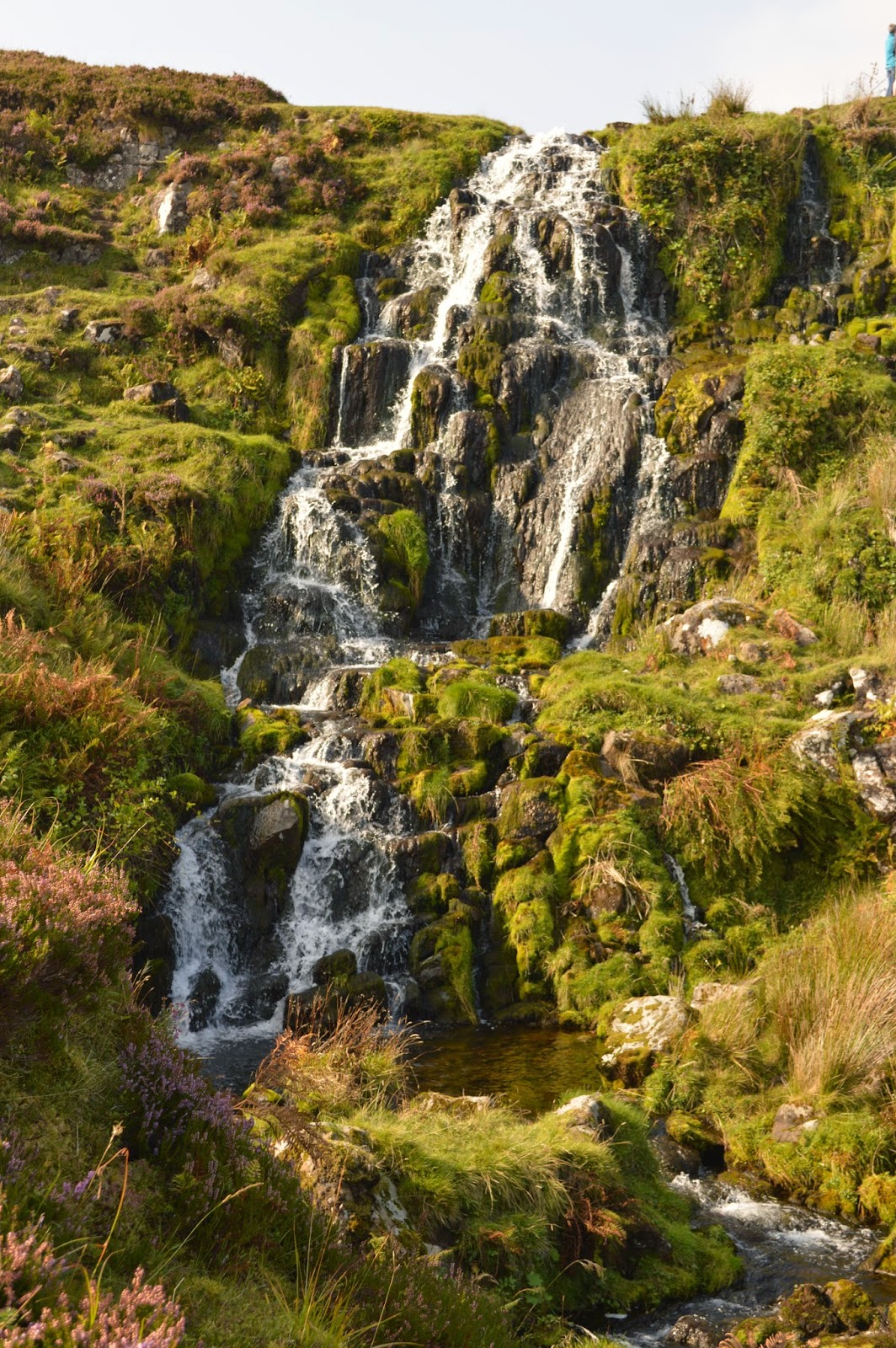 Langs het water gaat het langzaam omhoog. Het asfalt maakt plaats voor een smal pad door het struikgewas. Later wordt het rotsachtig en moeten we extra goed uitkijken waar we lopen. Het uitzicht is prachtig! Het water, de heuvels, het groen, de rotsen. Het zijn steeds dezelfde ingrediënten die voor een verrassend wisselend plaatje zorgen. We boffen weer, het zonnetje maakt alles zo mooi. En goed begaanbaar. Met regen is de kans op glibber- en dus valpartijen veel groter. Het zal niemand verbazen dat we veel foto’ s maken. Na zeker een uur omhoog geklommen te zijn komen we op een punt waar we om een berg heen kunnen en dalen achterlangs naar beneden. Geconcentreerd nemen we de afdaling tot we na in totaal zo’n zeven kwartier weer in het centrum uitkomen. Een superleuke tocht! Maar nu koffie. We komen bij een Mexicaanse gelegenheid die op een bordje zegt de lekkerste koffie van de stad te hebben. Dat willen wij proeven. Inderdaad is die erg lekker, evenals de worteltjestaart. Maar het is niet hetgeen op mij de meeste indruk maakt. Dat is het leuk uitziende meisje dat de bestelling opneemt. Of is het een jongen in wording..Ze heeft duidelijk de aanzet tot een snor en een sikje. Bizar is dat de andere drie het niet is opgevallen. Onbegrijpelijk. Observeren is een belangrijk deel van mijn vak, zal ik maar zeggen. We verlaten ‘ Arriba’ en gaan terug naar ‘ The pink House’ waar we ieder in ons eigen verblijf vertoeven. Tot het tijd is om naar plein te gaan waar we zullen opstappen voor de drie uur durende eilandtour. In het witte busje rijden we door het noordelijke deel van het Isle of Skye.