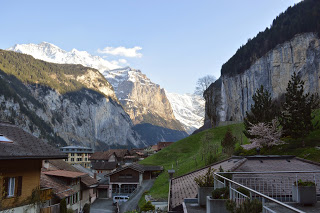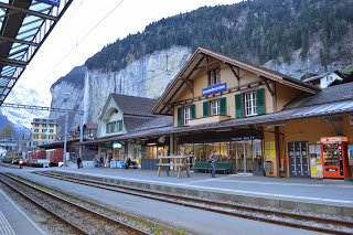 We verlaten het uitstekende hotel Zimmerhorn en lopen de paar minuten naar het station, onderweg begeleid door koeiebellen. In Lauterbrunnen hadden we nog wel een dag willen blijven, er is genoeg wat de moeite van het bekijken waard is.