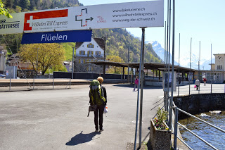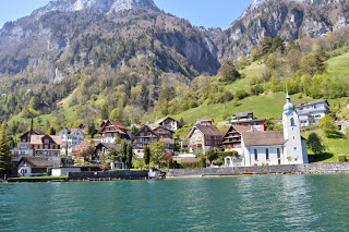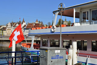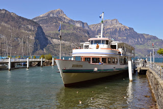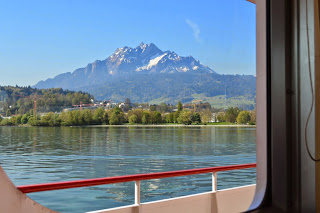 Maar goed, we zitten dus in de trein en komen na een aantal uur in Luzern aan, daar stappen we over op de Wilhelm Tell, een boot die ons over het Vierwoudstedenmeer naar Flüelen brengt. De boottocht duurt ruim 2,5 uur, doet verschillende plaatsjes aan en laat de afwisseling voortduren. Hoewel de wind op het water fris is, is het in het zonnetje prima te doen. Binnen zitten is een tweede optie, we doen beide. Vanachter de grote ramen is het plezier niet minder, de wind om de oren wel.