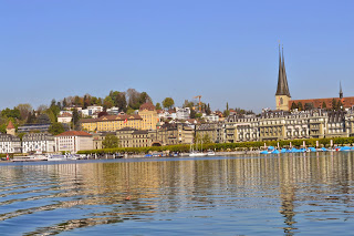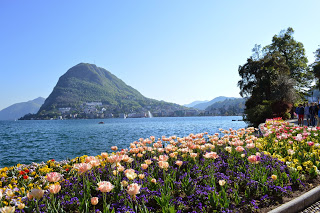 Het hotel, Continental Park, is heel groot en heeft verschillende gebouwen en staat op nog geen vijf minuten van het station. We installeren ons en vertrekken naar het centrum voor een eerste indruk. Al heel snel komen we in het typische centrum van Lugano met smalle op- en aflopende straatjes. Heel sfeervol en precies wat wij wilden tegenkomen in een Italiaans deel. Op ons gemak wandelen we door de steegjes en over pleintjes en komen uit op het Piazza Riforma, het belangrijkste plein van Lugano. We lopen verder naar het water, het meer van Lugano en door een park waar de vele tulpen (!) bijna zijn uitgebloeid. We gaan een tijdje bij het meer zitten om keren dan terug naar het Piazza Riforma om daar wat te gaan eten. Daarna houden we het voor gezien en kuieren naar het hotel. Morgen weer een dag. Sophie komt dan een dagje en gaat met ons Lugano verkennen. Ze logeert hier in de buurt in een vakantiehuis van een Zwitsers studiegenootje. De meeste meisjes komen pas zaterdag, vandaar. En ze heeft een lang paasweekend wat ze lekker wil uitbuiten met het verder verkennen van Zwitserland.