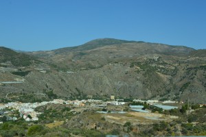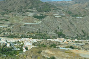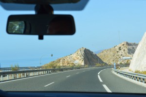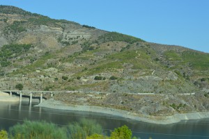 De olijfbomen hebben we grotendeels achter ons gelaten, de valleien waar we doorheen rijden zijn vooral droog en kaal, met hier en daar wat groen met zanderige rotsformaties. Een desolaat gebied wat als een filmisch decor voorbijgaat. Langs de weg staan speciale borden die ik niet ken. Jos en Gerda weten te vertellen dat het bord de nabijheid van een grindbak aangeeft. Grindbakken bevinden zich op strategische plaatsen waar de weg naar beneden gaat. Speciaal voor auto’s met remproblemen. De grindbak helpt om de vaart eruit te halen. Bijzonder, gelukkig hoeven wij er geen gebruik van te maken. Het is een mooie rit door het licht ruige gebied dat door verlatenheid en zijn onherbergzame aanblik iets van nostalgie oproept. Het is zo’n stuk aarde dat er honderd jaar geleden waarschijnlijk ook zo uitgezien heeft en dat over honderd jaar nog steeds doet. Ik geniet wel en maak wat foto’s vanachter het glas.