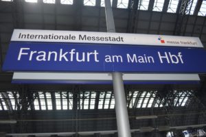 Het is 7.00 uur en forenzen tijd. Wij kuieren relaxed met onze rugzakken tussen de hordes gehaaste mensen, op werk naar werk of school. Als je er geen onderdeel van bent zie je beter hoe jachtig het dagelijks leven kan zijn. We slaan broodjes en drinken in voor onderweg, kijken door het raam van een nog niet open zijnde EK voetbalfan artikelen winkelen, waar het oranje ontbreekt en settelen ons op het perron waar de trein naar Frankfurt komt. We kunnen hier een half uur gratis gebruik maken van een Wi-Fi netwerk en buiten dat lekker uit met het lezen en versturen van berichtjes. De tijd vliegt, voordat we het weten staat de trein voor onze neus. Instappen weer.