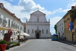 De omgeving waardoor we lopen is het verademing. We genieten van de ruimte, de rust,de gebouwen. Als we de Katarine kerkin gaan merken we dat we niet verderdan het voorportaal komen: het hekwerk is gesloten. We lopen weer terug wat een vrouw met een hond opmerkt. ‘ Het is de mooiste kerk van ZAgreb’ zegt ze. En ze neemt ons weer mee naar binnen. Terwijl wij door het traliewerk kijken vertelt zij dat devkunstenaar met het schilderen van deze kerk een hoogstandje heeft verroicht. Alles is op een vlakke ondergrond geschilders met een driedimensionaal resultaat. Ze wijst naar de zuilendie volgens haar geen zuilen zijn, maar een meesterwerk van de kunstenaar die werkte naar het principe van ‘ trompe l’ oeuil’ Hij is daarin meerdan geslaagd! De vrouw legt veder uit dat het gebruik van de overheersende kleur rose te maken heeft met deOosenrijkse (keizerin?) Theresa die altijd naar deze kerk kwam. We bedanken de vrouw voor de leuke ontmoeting en gaan richting het terras schuin tegenover de kerk. Koffietijd. Terijl we praten over de brede politieke de delegatie in de buurt, de auto’s en aanwezige beveiling klinkt opeen een gingantische knal als van een ontploffing. Ik schrik me rot. Een aanslag is snel gedacht in de context van ons ponderwerp. Theo herinnert zich echteriet gelezen te hebben over een kanon dat elke dag om 12.00 uur afgaat. Het is precies 12.00 uur… Heeft een land dat nog niet zo lang een oorlog achter de rug heeft, daar behoefte aan, vraag ik me af.