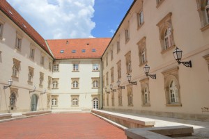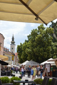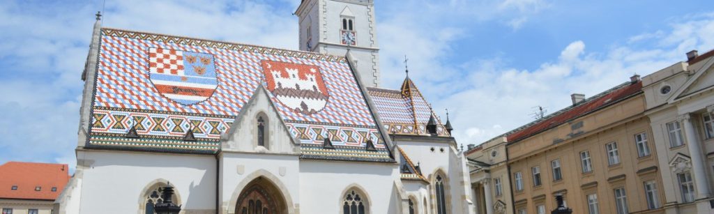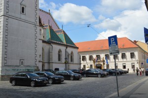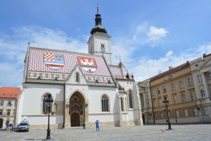 Voordat we in de tweedehelft van de middag op de trein stappen naar Plitvice willen we nog de St Marka kerk bezoeken, die heeft een prachtig dak. We moeten richting het ‘ demonstrantenplein’ waar het aanzienlijk rustiger, maar nog steeds druk is. Het is het hart van de Zagrebfeesten die dezeweek zijn. Bierstands, informatiepunten, vlaggen en tribunes staan klaar voor een nieuwe ronde. We zoeken borden, vinden die en lopen om vanwege werkzaamheden. We komnn bij de plek waar de kabelbaan is. Uit de informatie die wegelezen hebben weten we dat die wegens onderhoud gesloten is, dus zijn we niet onaangenaam verrast dat we naar boven moetenlopen. Het is weerwarm en zonnig vandaag, de wolken die er zijn pesten de zon niet weg.