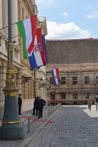 Als we boven komen zijn we er snel achter dat dit is waar we gisteren zo naar gezocht hebben, wat we hoopten te zien, wat wij aantrekkelijk vinden. Het is hier ruim, rustig en prachtig. De St. Marka kerk met z’n prachtige dag doet het extra goed in de zon. Mozaiekdaken als dit zagen we veel vaker in Budapest. Het geeft een gebouw zoveel extra sfeer en daardoor ook de omgeving. Het staat aan een ruim plein waar maar een handjevol mensen loopt. Wat een verschil met beneden! Op het pleinstaat een auto van de pers en iets verderop staat zeker een dozijn grote zwarte auto’s met chauffeur. Sommigen hebben geen gewoon nummerbrd, staat alleen het woord politice. In de nabijhied een gebouw met open deur en veel bewaking. Overleg op hoog niveau verklaren wij. We hebben al gezien dat in dit gedeelte ook veel buitenlandse ambassades zijn. Wat Theo opvalt zijn de diverse politieposten op hoeken van straten: gesloten hokjes met glas waarvan het onmogelijk is door naar binnen te kijken. Misschien om het verkeer richting ambassades en de belangrijke ontmoeting/bespreking goed te kunnen controleren? Wegen snel af te kunnen zetten?