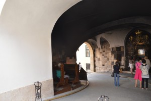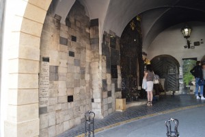 Wanneer we later onze weg vervolgen stuiten we onverwachts op een kapelletje waarvan het altaar zich aan de ene kant van de weg bevindt en de kerkbankjes aan de andere kant. Wandelaars en fietsers laveren daar doorheen. Bijzonder, ook als achter een duur in de muur een non zit die kaarsen verkoop die daar aangestoken enneergezet kunnen worden. We zien veel vroomheid in de stad. Ook jonge mannen en vrouwen als broeders en nonnen zijn zichtbaar in het straatbeeld.