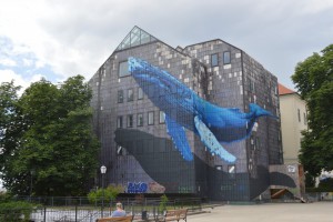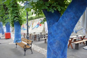 Verderop zien we een park waar kunstenaars an het werk zijn geweest. Bomen in het blauw, creaties aan muren en in bomen. Leuk om daar door en langs te lopen.