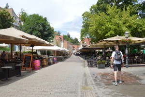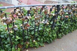 We lopen verder en komen op een pleintje waarvan we een prachtig uitzicht op de oude stadhebben. We zien hier ook, zoals in vele andere steden hekken met heel veel slotjes erop. Liefde vastketenen is overal populair. En mocht het niet lukken: vlakbij bevindt zich het museum van de verbrokne relaties. Wij laten het links liggen, houden het liever gezellig.